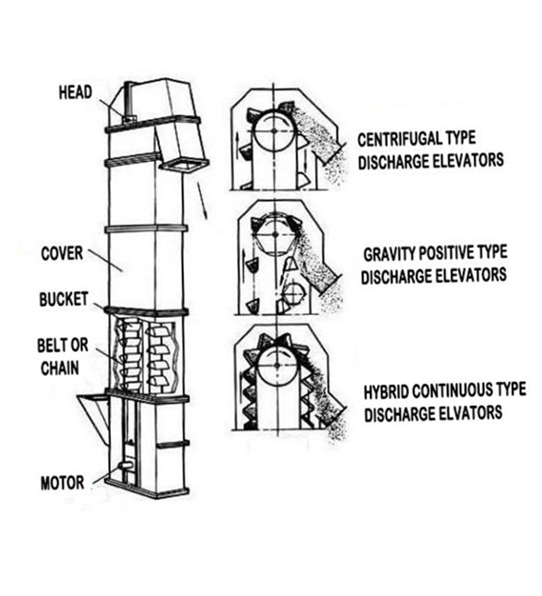 Positive Discharge Bucket Elevator These elevators are used where the material is either sticky or light and fluffy. The buckets after passing over the head sprocket are inverted over the idler sprocket, thus providing a positive discharge of material. Further as the buckets are to be inverted over the idler sprocket, these bucket elevators have to be of double chain design, as the bucket are held in between two chains.The buckets after passing over the head sprocket are inverted over the idler sprocket, thus providing a positive discharge of material. The speeds for this elevator are lower at about 0.6 m/sec.